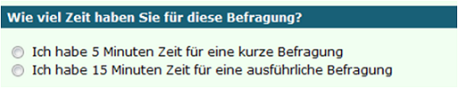 • Geben Sie den Teilnehmern eventuell die Möglichkeit, zwischen ausführlichen und kürzeren Antworten zu wählen. Sie könnten auch Sprünge einbauen, die dann den Weg verkürzen, wenn jemand die Befragung verlassen möchte. Dann hätten Sie die Chance, diese Personen wenigstens noch zu den allerwichtigsten Fragen zu lenken. Sie könnten ganz konkret Fragen, wie lange die Personen Zeit haben:
